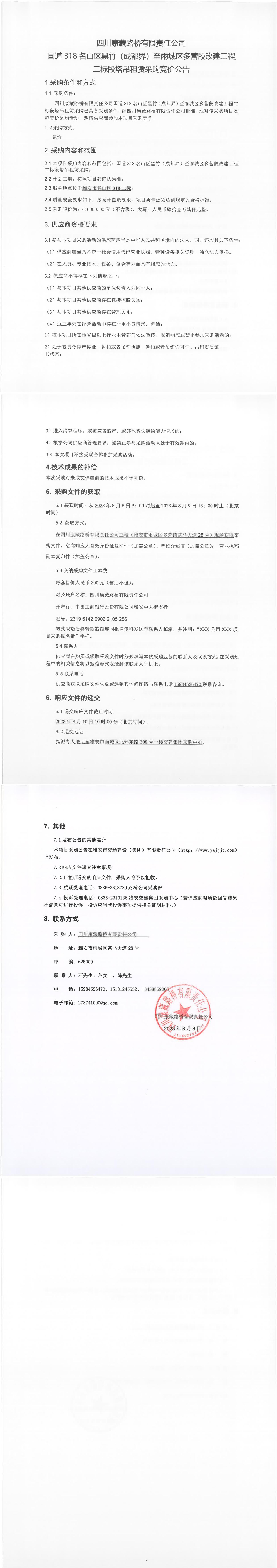 四川康藏路橋有限責(zé)任公司國道318名山區(qū)黑竹(成都界)至雨城區(qū)多營段改建工程二標(biāo)段塔吊租賃采購競價(jià)公告