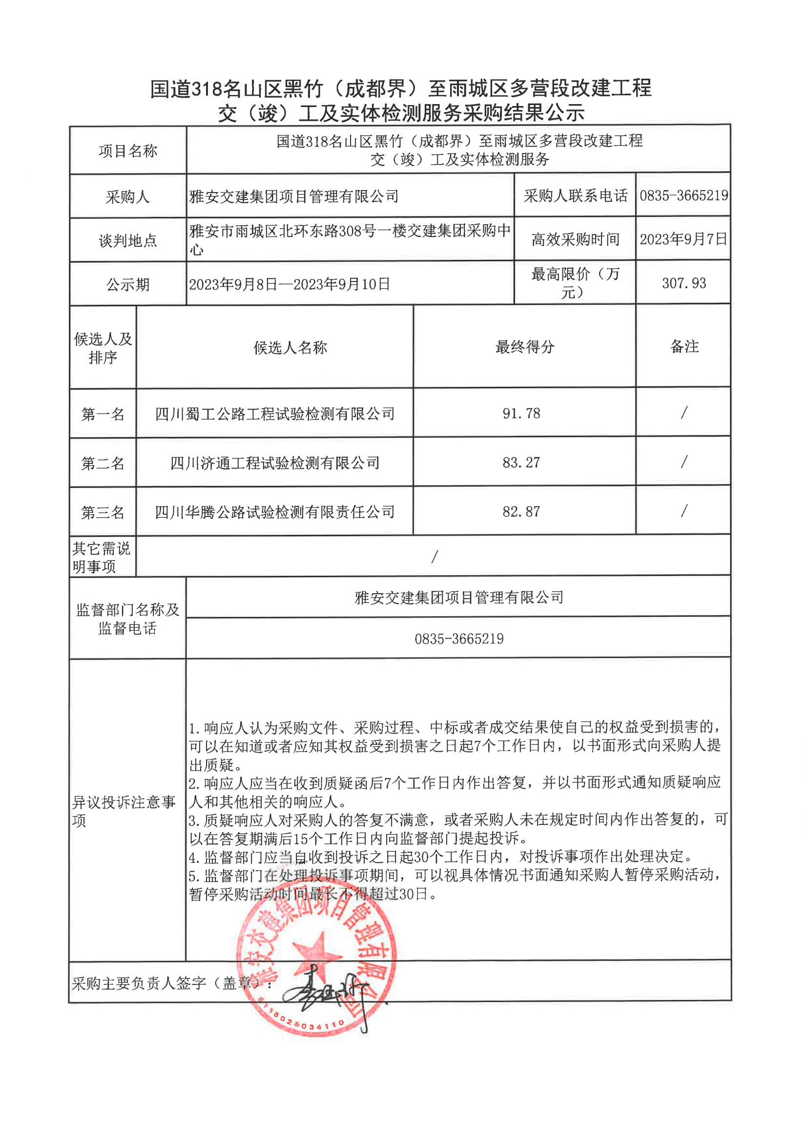雅安交建集團(tuán)項(xiàng)目管理有限公司國道318名山區(qū)黑竹(成都界)至雨城區(qū)多營段改建工程交(竣)工及實(shí)體檢測服務(wù)采購結(jié)果公示