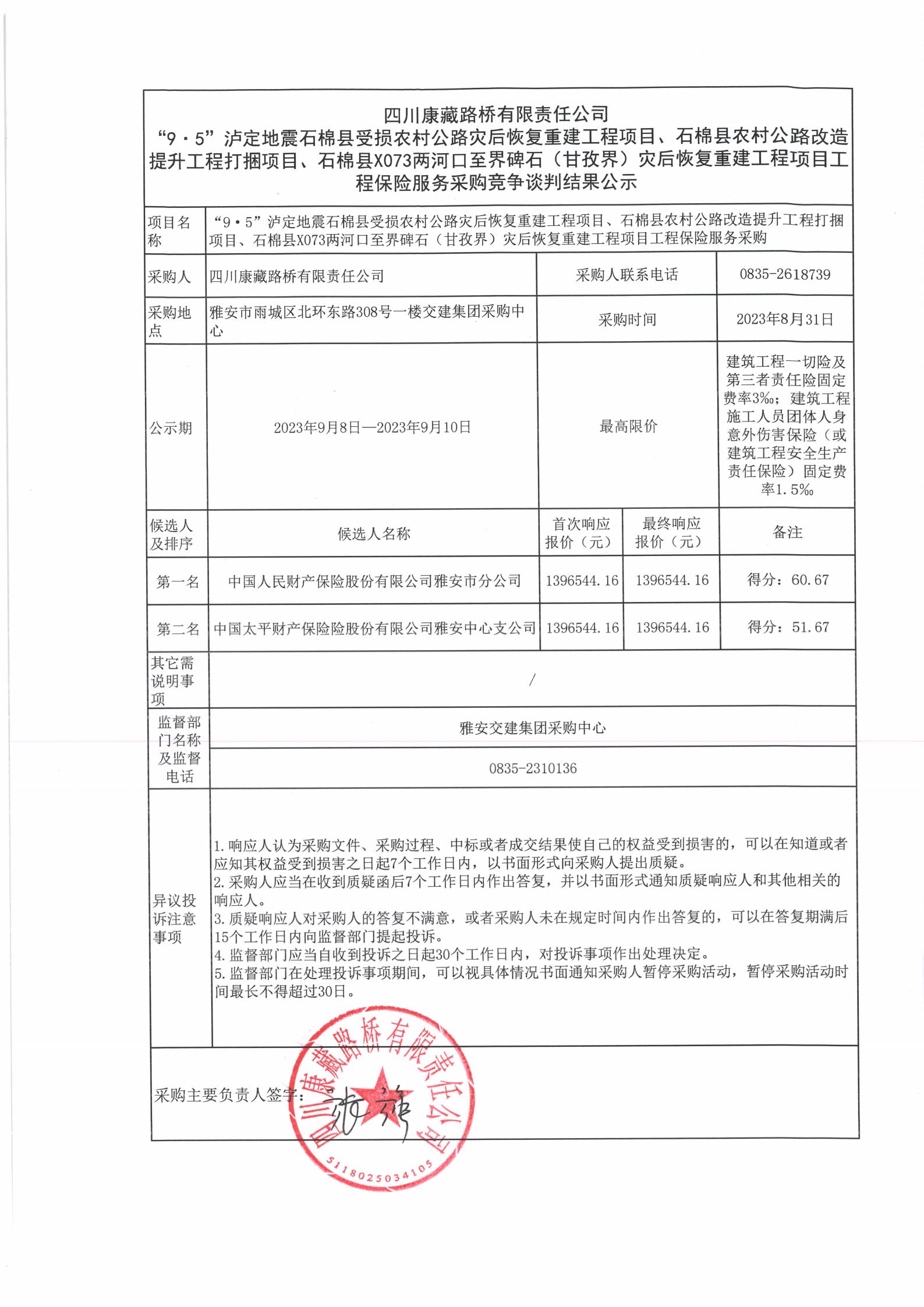 四川康藏路橋有限責(zé)任公司“9·5”瀘定地震石棉縣農(nóng)村公路災(zāi)后恢復(fù)重建工程項(xiàng)目、石棉縣農(nóng)村公路改造提升工程打捆項(xiàng)目、石棉縣X073兩河口至界碑石(甘孜界)災(zāi)后恢復(fù)重建工程項(xiàng)目工程保險(xiǎn)服務(wù)采購競爭談判結(jié)果公示