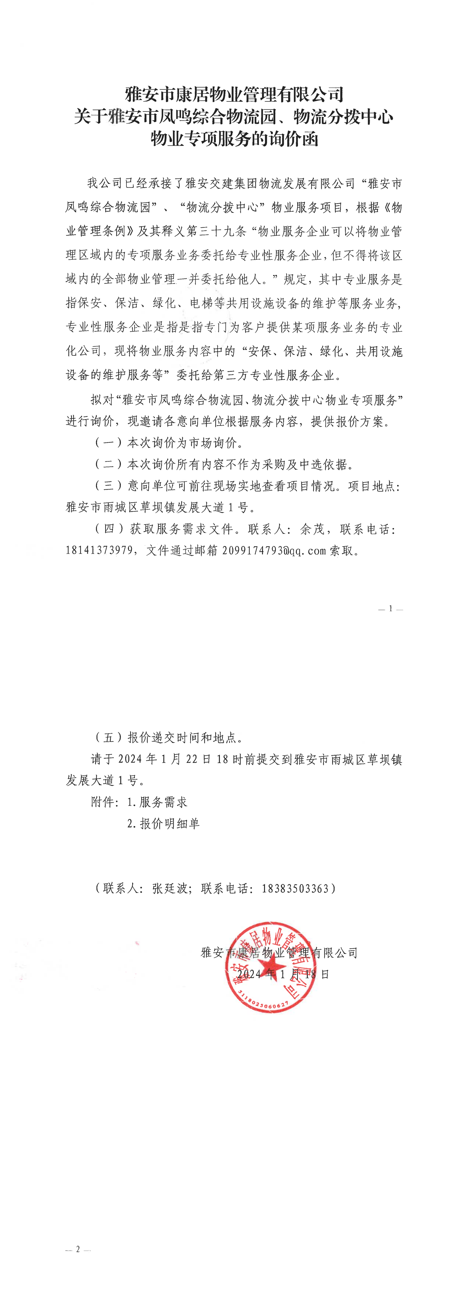 雅安市康居物業(yè)管理有限公司關于雅安市鳳鳴綜合物流園、物流分撥中心物業(yè)專項服務的詢價函