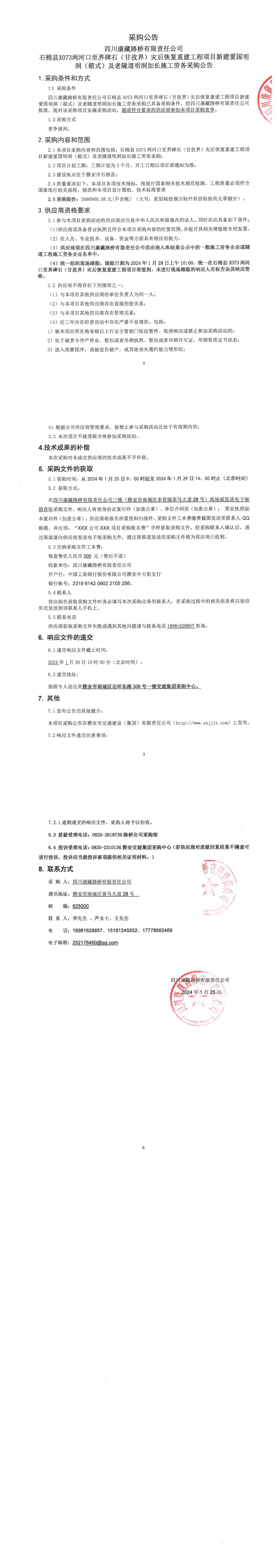 四川康藏路橋有限責(zé)任公司國(guó)道318名山區(qū)黑竹(成都界)至雨城區(qū)多營(yíng)段改建工程三標(biāo)段監(jiān)控中心材料采購(gòu)(第二次)采購(gòu)公告
