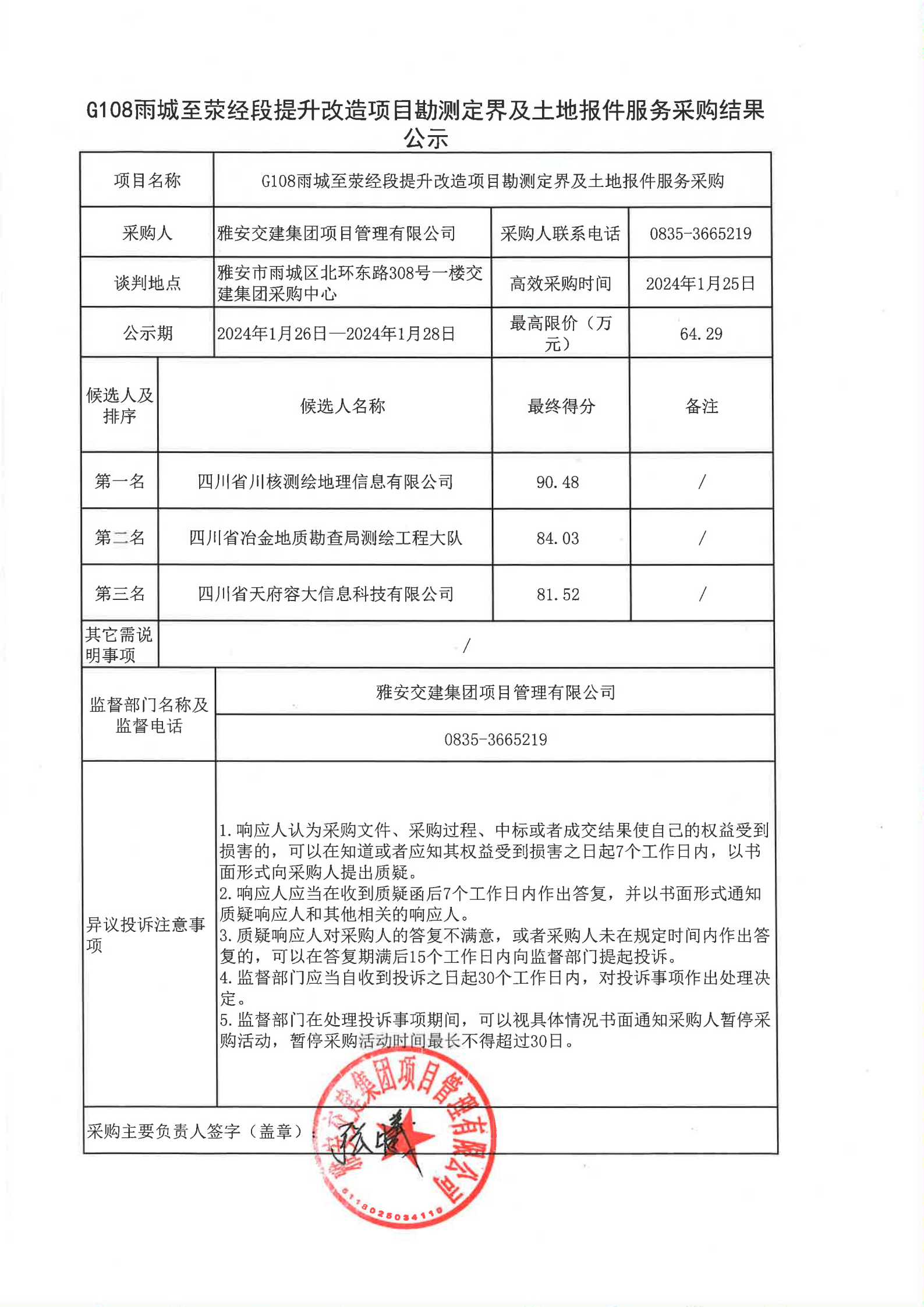 四川康藏路橋有限責任公司G108雨城至滎經段提升改造項目勘測定界及土地報件服務采購結果公示