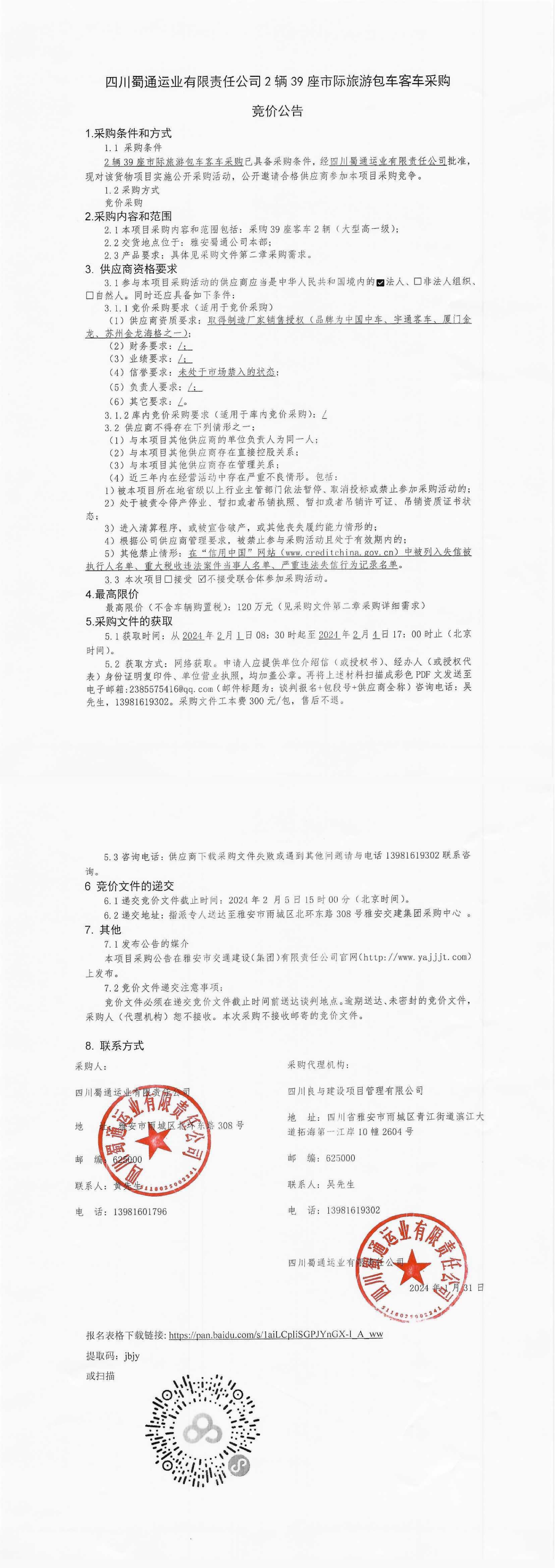 四川蜀通運(yùn)業(yè)有限責(zé)任公司2輛39座市際旅游包車客車采購競價(jià)公告