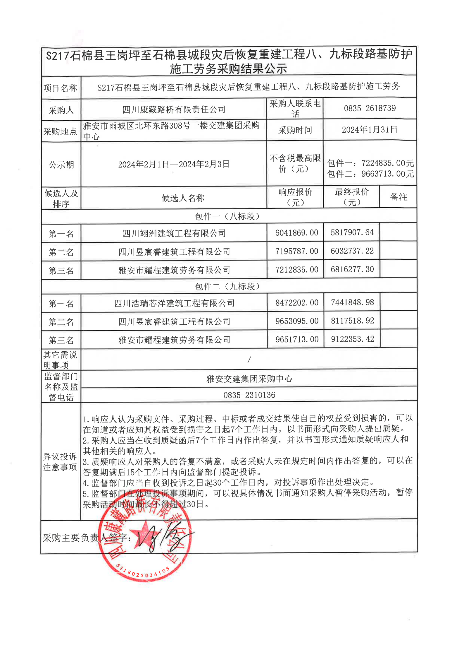 四川康藏路橋有限責(zé)任公司S217石棉縣王崗坪至石棉縣城段災(zāi)后恢復(fù)重建工程八、九標段路基防護施工勞務(wù)采購結(jié)果公示