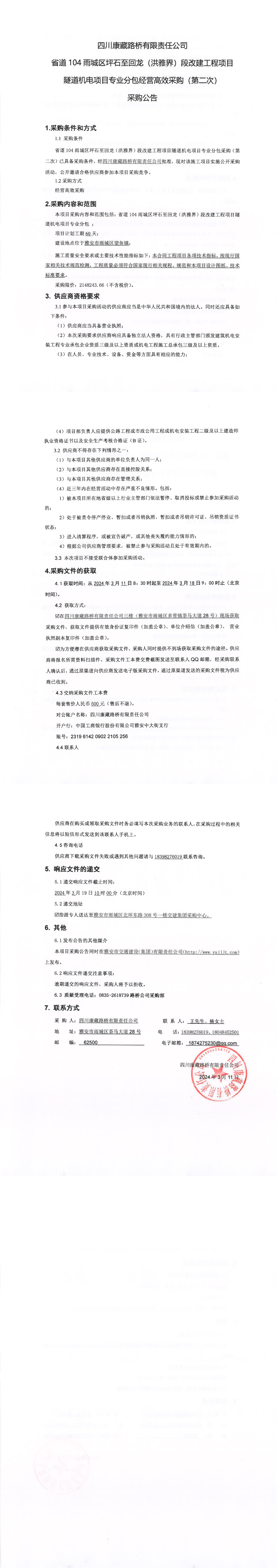 四川康藏路橋有限責(zé)任公司省道104雨城區(qū)坪石至回龍(洪雅界)段改建工程項(xiàng)目隧道機(jī)電項(xiàng)目專業(yè)分包經(jīng)營高效采購(第二次)采購公告