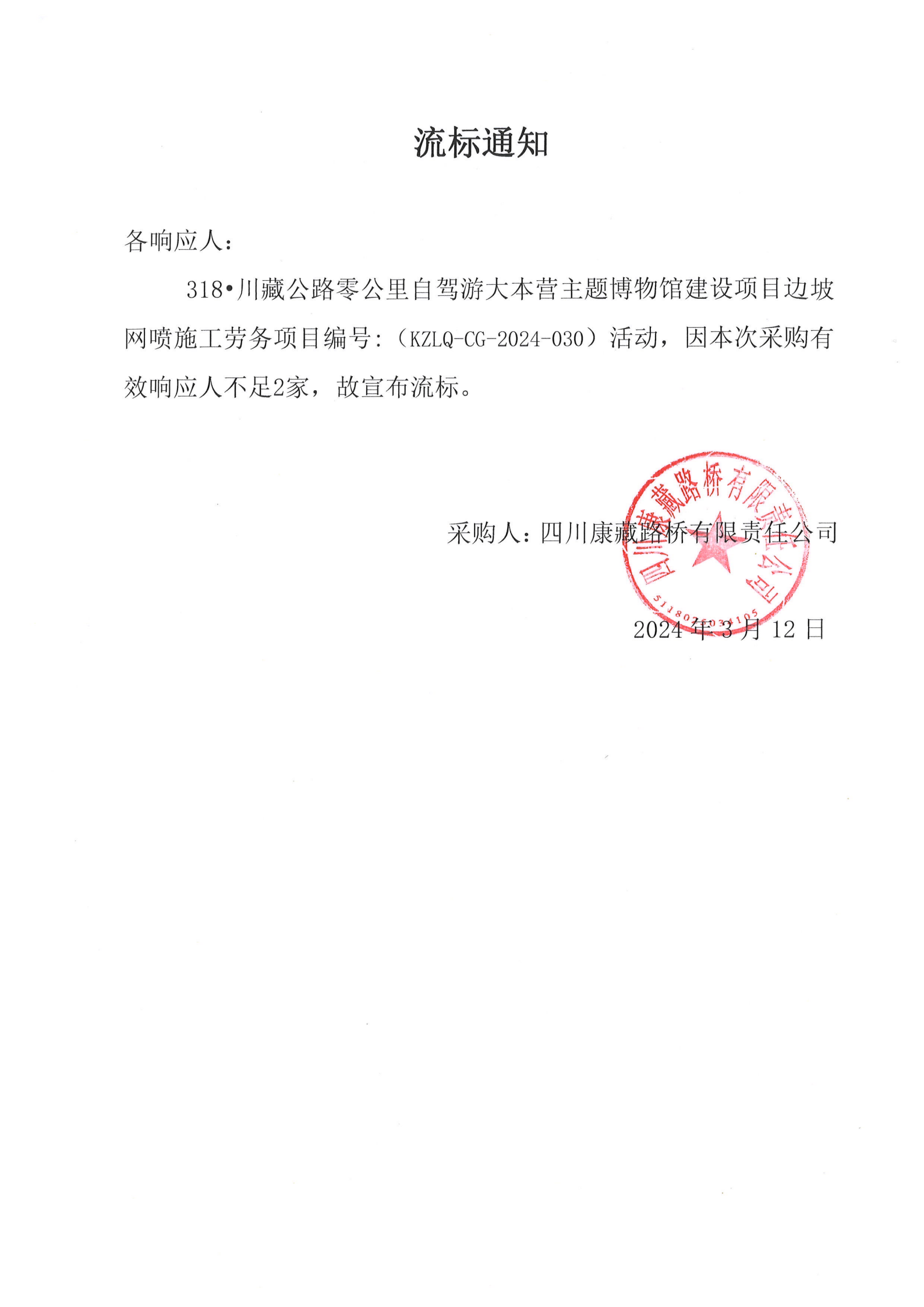 四川康藏路橋有限責(zé)任公司318·川藏公路零公里自駕游大本營(yíng)主題博物館建設(shè)項(xiàng)目邊坡網(wǎng)噴施工勞務(wù)流標(biāo)通知