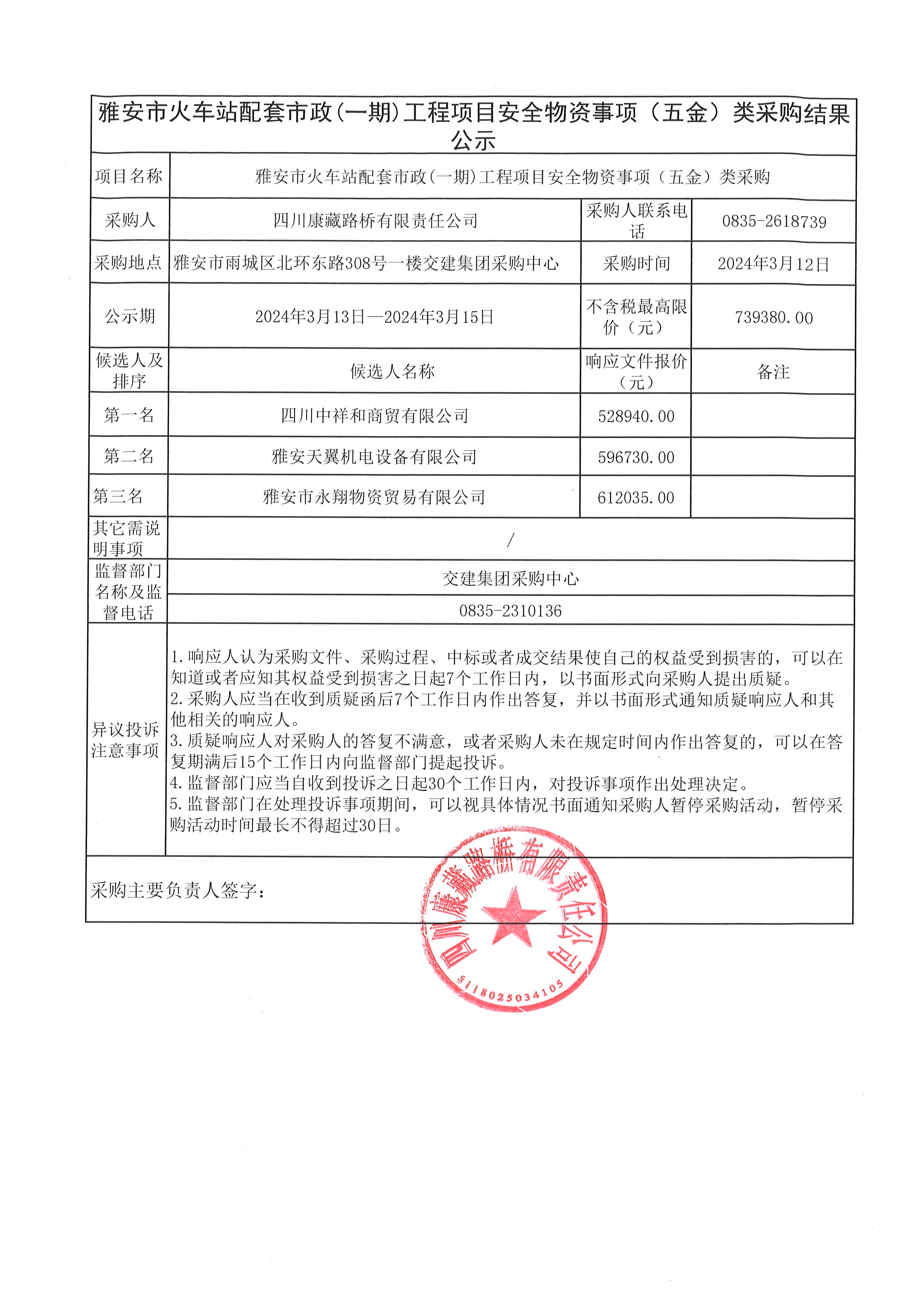 四川康藏路橋有限責(zé)任公司雅安市火車站配套市政(一期)工程項目安全物資(廣告)采購結(jié)果公示