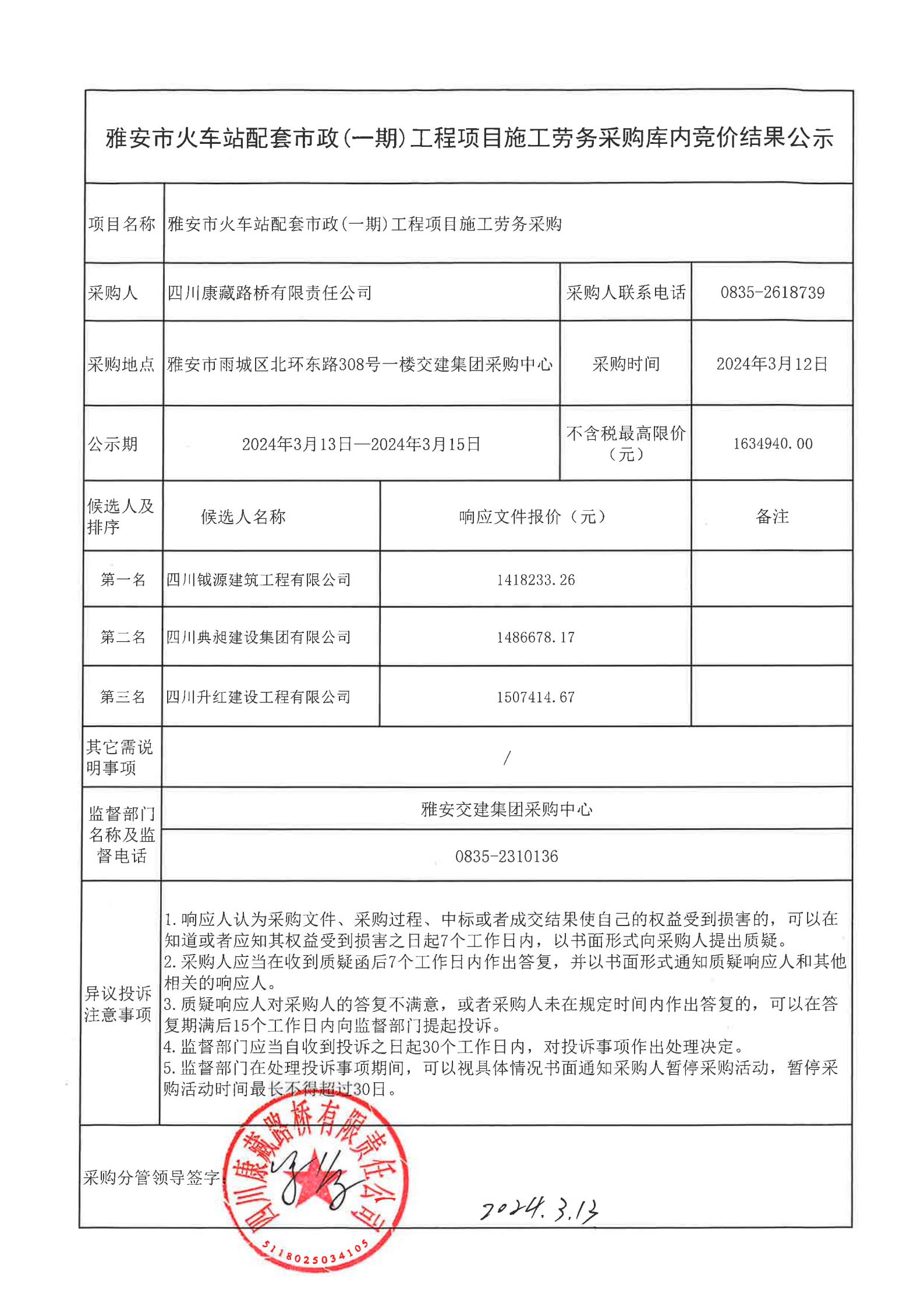 四川康藏路橋有限責(zé)任公司雅安市火車站配套市政(一期)工程項(xiàng)目施工勞務(wù)采購(gòu)結(jié)果公示