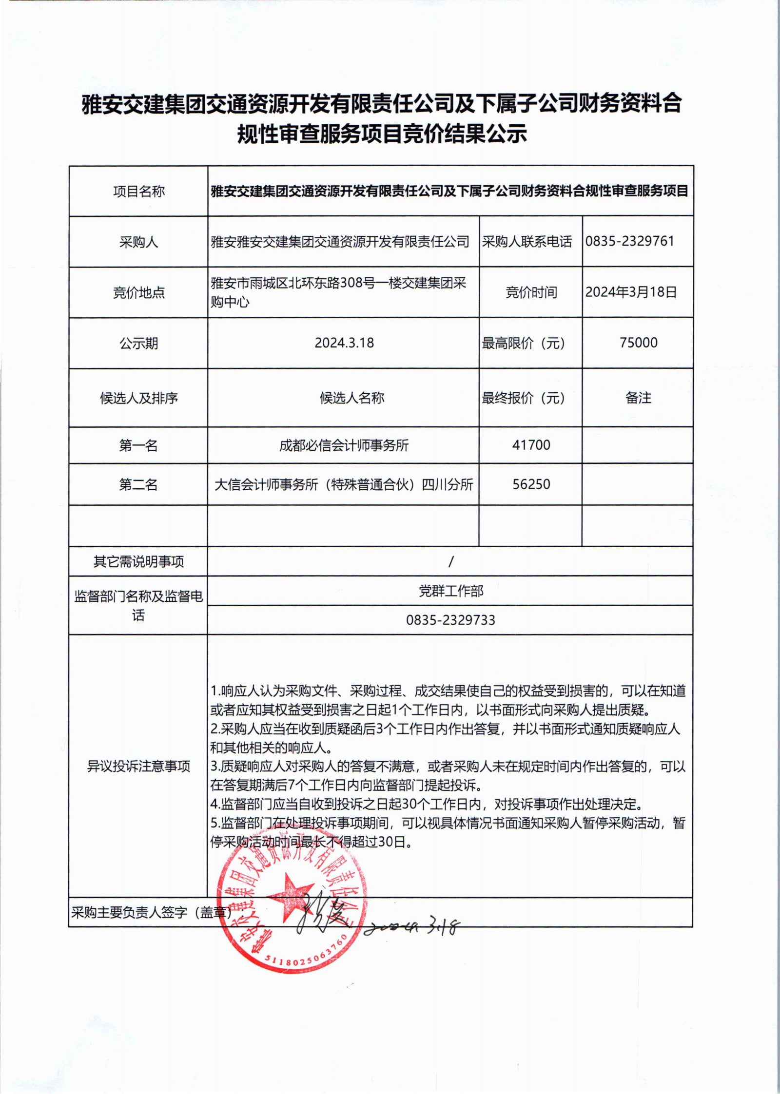 雅安交建集團(tuán)交通資源開發(fā)有限責(zé)任公司及下屬子公司財務(wù)資料合規(guī)性審查服務(wù)項目競價結(jié)果公示