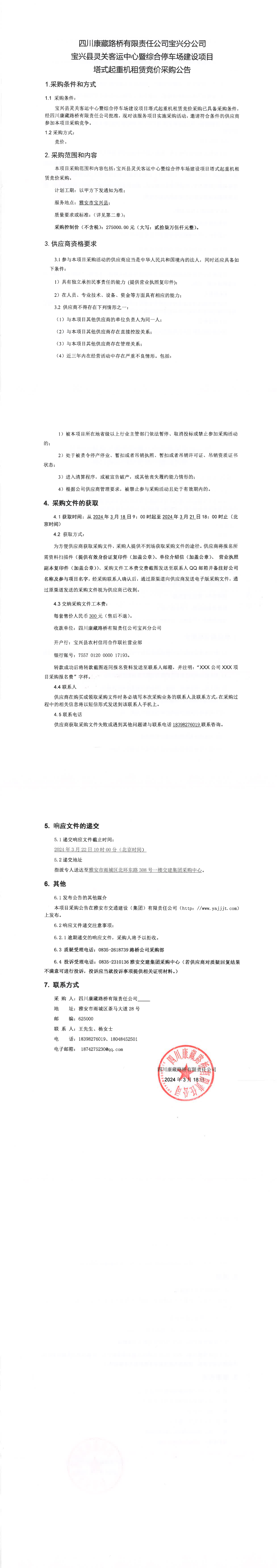 四川康藏路橋有限責任公司寶興縣靈關(guān)客運中心暨綜合停車場建設(shè)項目塔式起重機租賃競價采購公告