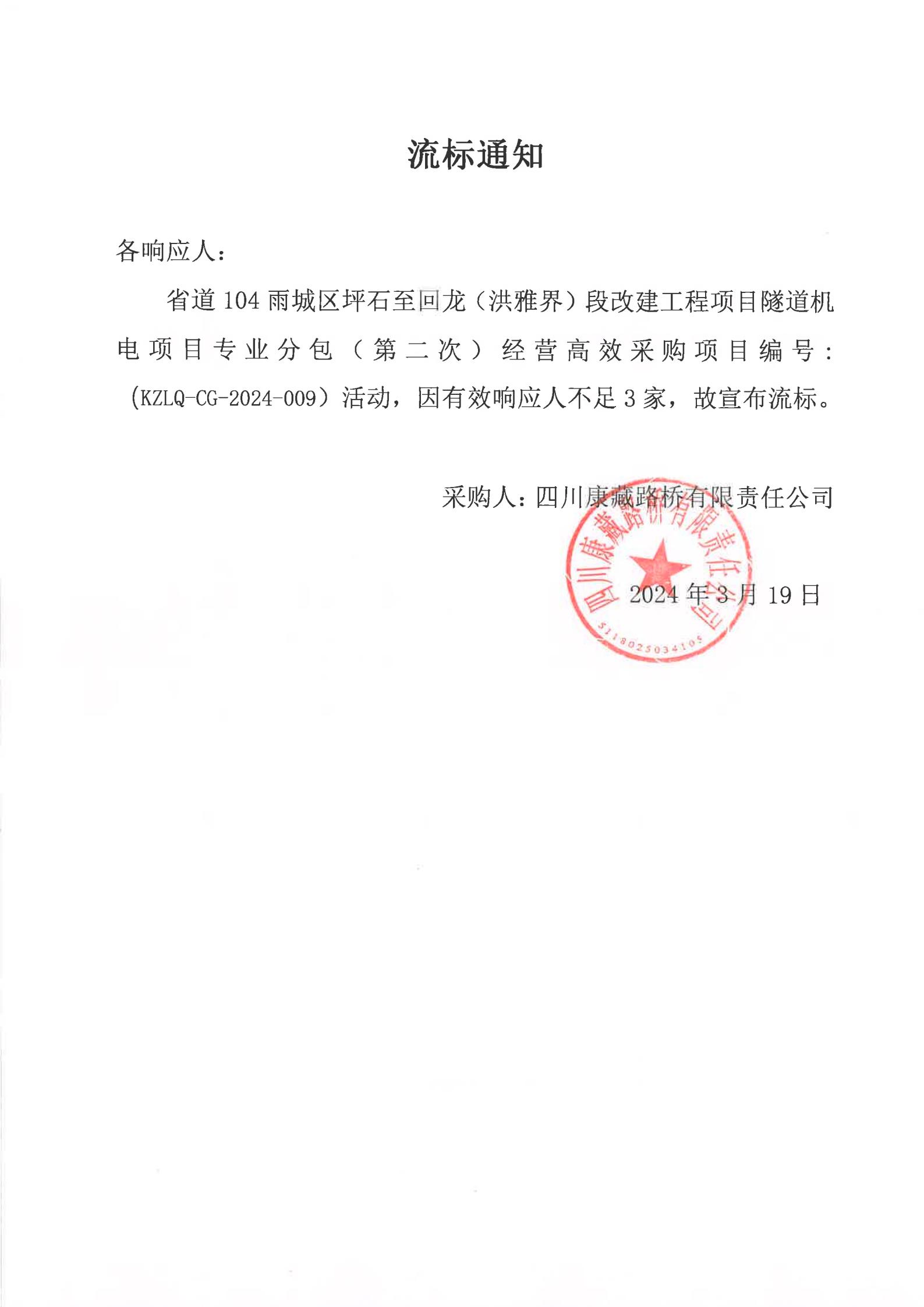 四川康藏路橋有限責任公司省道104雨城區(qū)坪石至回龍(洪雅界)段改建工程項目隧道機電項目專業(yè)分包經營高效采購(第二次)流標通知