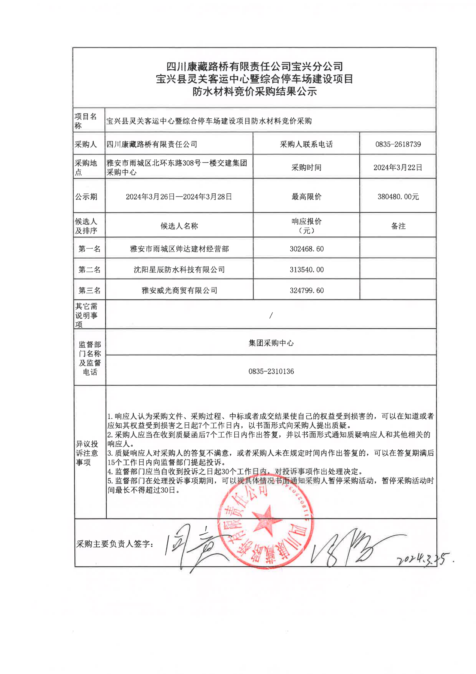 四川康藏路橋有限責(zé)任公司寶興縣靈關(guān)客運(yùn)中心暨綜合停車(chē)場(chǎng)建設(shè)項(xiàng)目防水材料競(jìng)價(jià)采購(gòu)結(jié)果公示