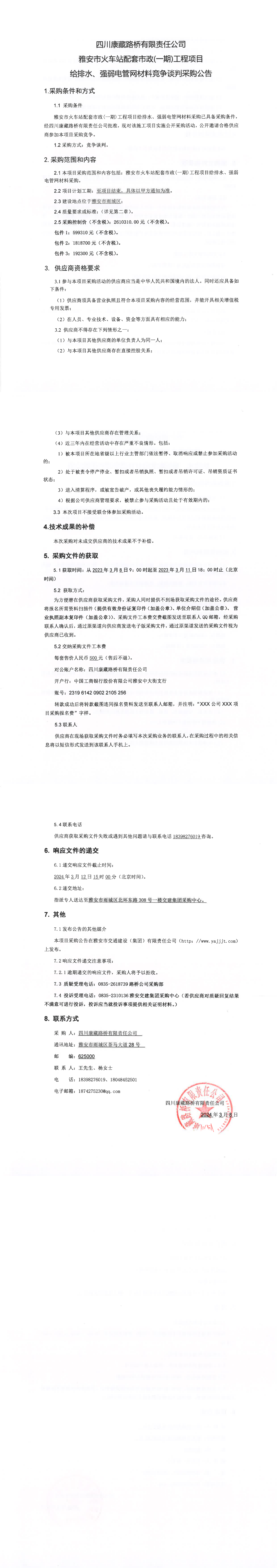 四川康藏路橋有限責(zé)任公司雅安市火車站配套市政(一期)工程項目給排水、強弱電管網(wǎng)材料競爭談判采購公告