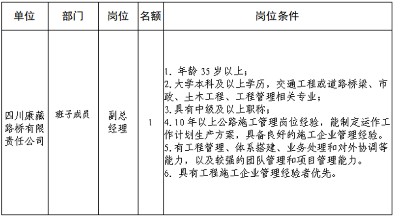 根據(jù)發(fā)展需要,決定面向社會公開招聘雅安市交通建設(集團)有限責任公司(以下簡稱“雅安交建集團”)所屬子公司班子成員4名,現(xiàn)將有關事項公告如下: