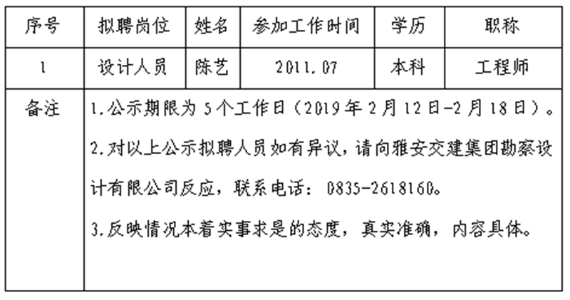 通過公開報(bào)名、資格審查、面試等程序,經(jīng)雅安交建集團(tuán)勘察設(shè)計(jì)有限公司研究,對(duì)以下1名擬聘用人員予以公示: