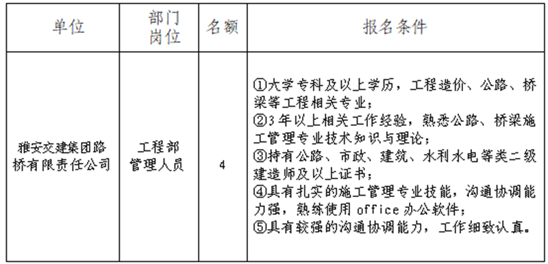 根據(jù)發(fā)展需要,決定面向社會公開招聘雅安市交通建設(shè)(集團)有限責(zé)任公司(以下簡稱“雅安交建集團”)所屬子公司工作人員4名,現(xiàn)將有關(guān)事項公告如下: