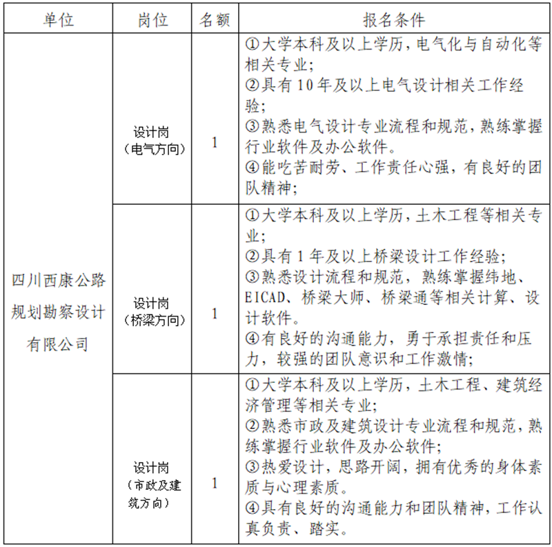 根據(jù)發(fā)展需要,決定面向社會(huì)公開招聘雅安市交通建設(shè)(集團(tuán))有限責(zé)任公司(以下簡稱“雅安交建集團(tuán)”)所屬子公司專業(yè)技術(shù)人才3名,現(xiàn)將有關(guān)事項(xiàng)公告如下: