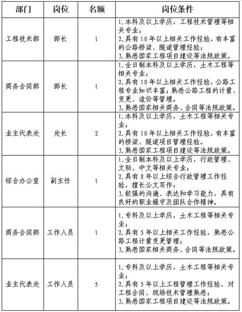 根據(jù)發(fā)展需要,決定面向社會公開招聘雅安市交通建設(shè)(集團(tuán))有限責(zé)任公司(以下簡稱“雅安交建集團(tuán)”)所屬子公司管理人員及工作人員共計11名,現(xiàn)將有關(guān)事項(xiàng)公告如下: