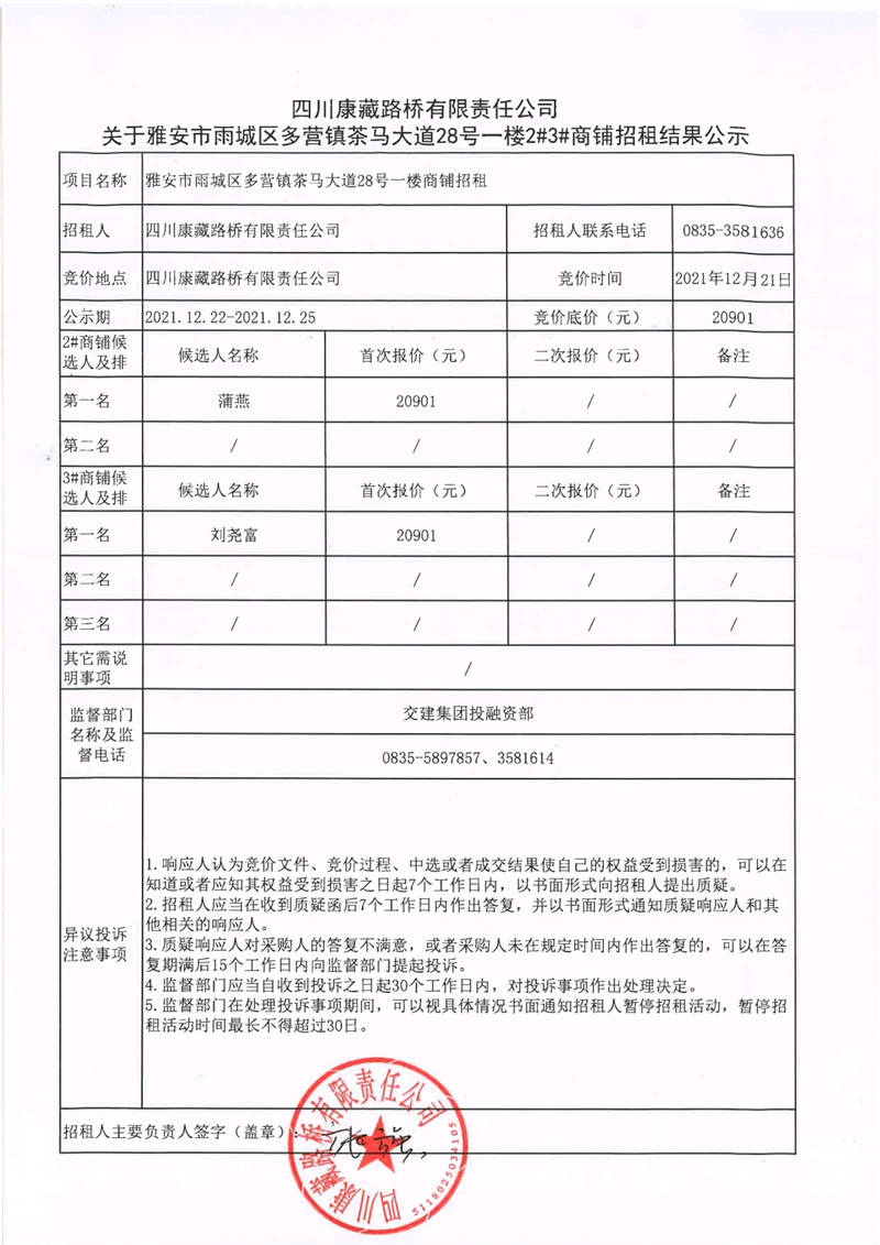 關(guān)于雅安市雨城區(qū)多營鎮(zhèn)茶馬大道28號(hào)一樓2#3#商鋪招租結(jié)果公示