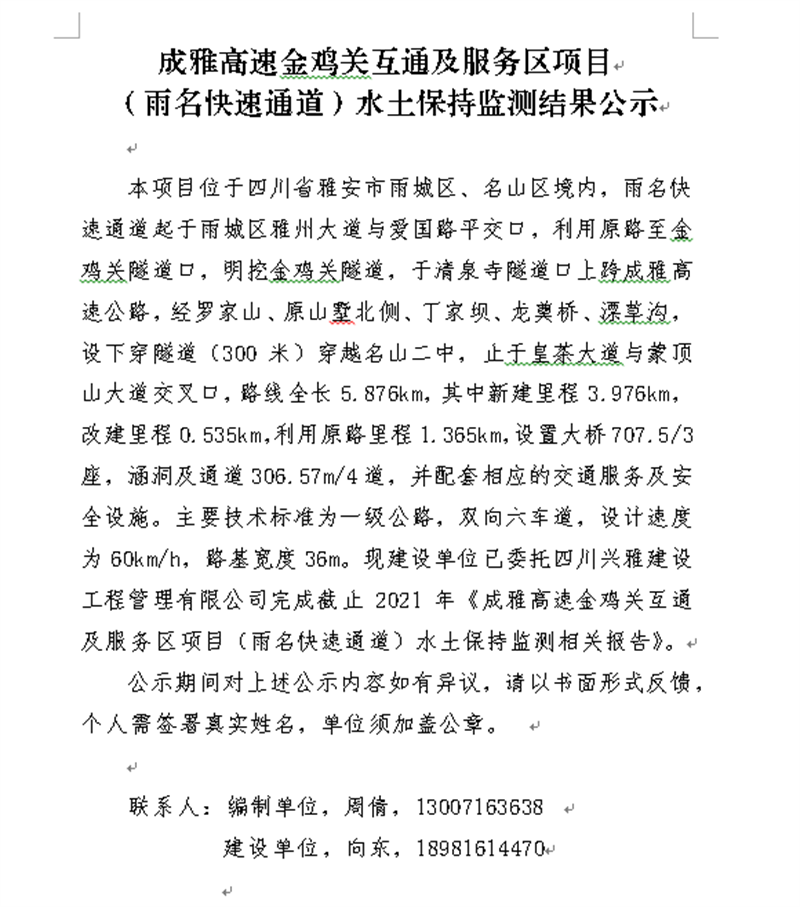 成雅高速金雞關(guān)互通及服務(wù)區(qū)項(xiàng)目(雨名快速通道)水土保持監(jiān)測(cè)結(jié)果公示