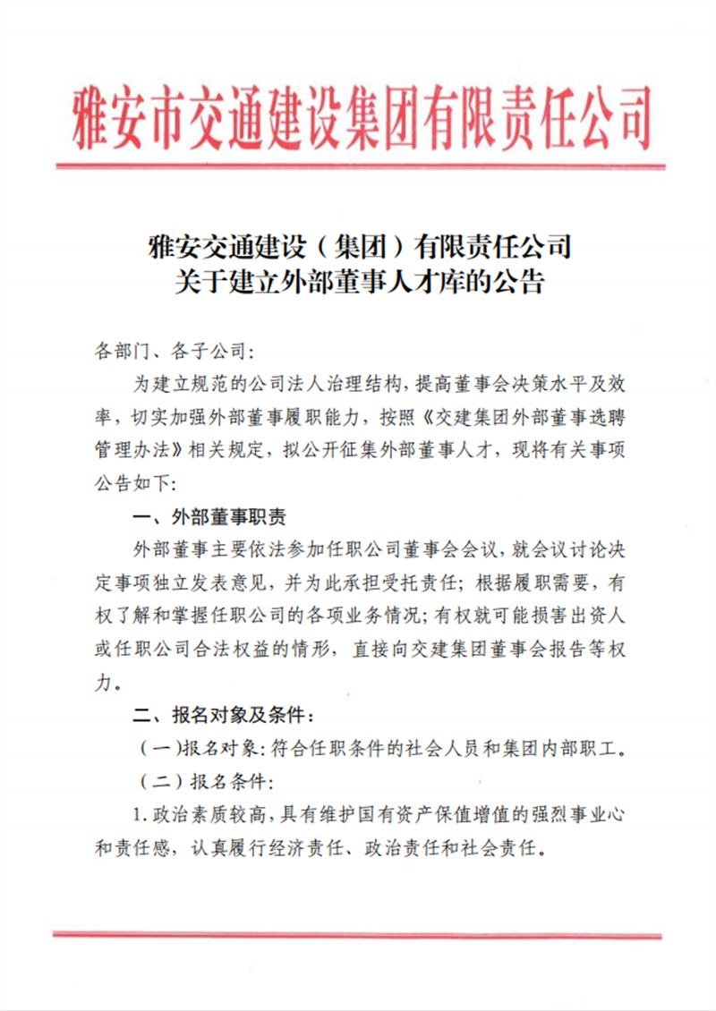 雅安交通建設(shè)(集團(tuán))有限責(zé)任公司 關(guān)于建立外部董事人才庫(kù)的公告