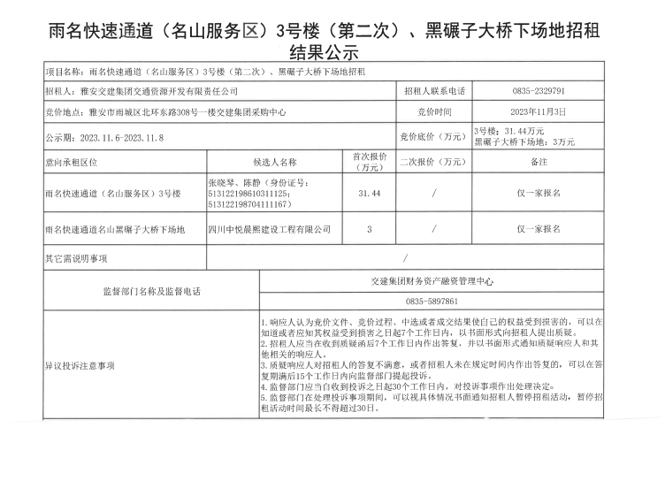 雅安交建集團交通資源開發(fā)有限責(zé)任公司雨名快速通道(名山服務(wù)區(qū))3號樓(第二次)黑碾子大橋下場地招租結(jié)果公示