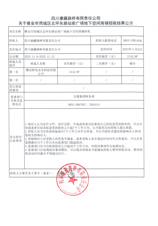 四川康藏路橋有限責任公司關(guān)于雅安市雨城區(qū)北環(huán)東路站前廣場地下空間商鋪招租結(jié)果公示