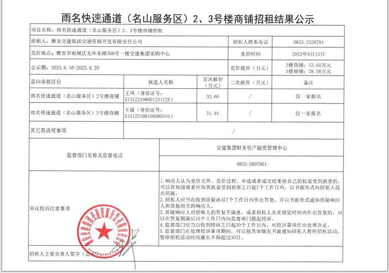 交通資源開(kāi)發(fā)公司雨名快速通道(名山服務(wù)區(qū))2、3號(hào)樓商鋪招租結(jié)果公示