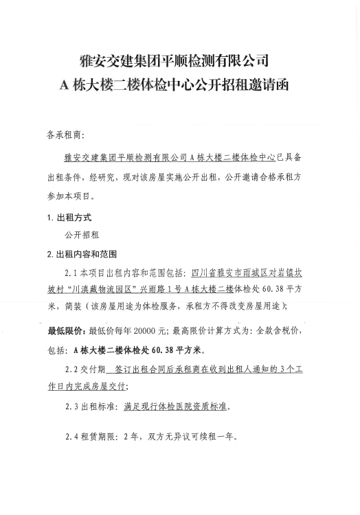 平順公司A棟大樓二樓體檢中心公開招租邀請函