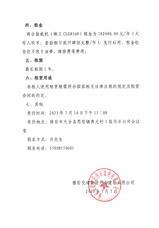 雅安交建集團丹石建材有限公司關于2臺裝載機公開招租的公告附件