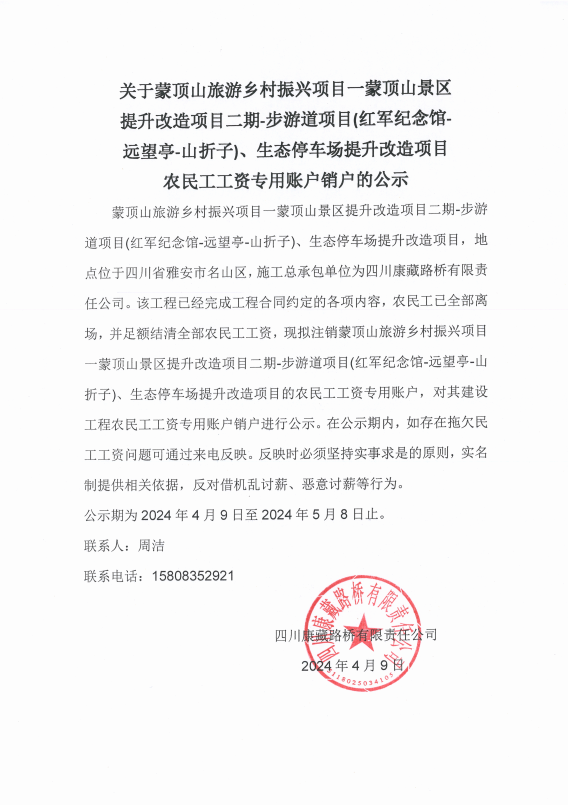 關(guān)于蒙頂山旅游鄉(xiāng)村振興項目一蒙頂山景區(qū)提升改造項目二期-步游道項目(紅軍紀念館遠望亭-山折子)、生態(tài)停車場提升改造項目農(nóng)民工工資專用賬戶銷戶的公示