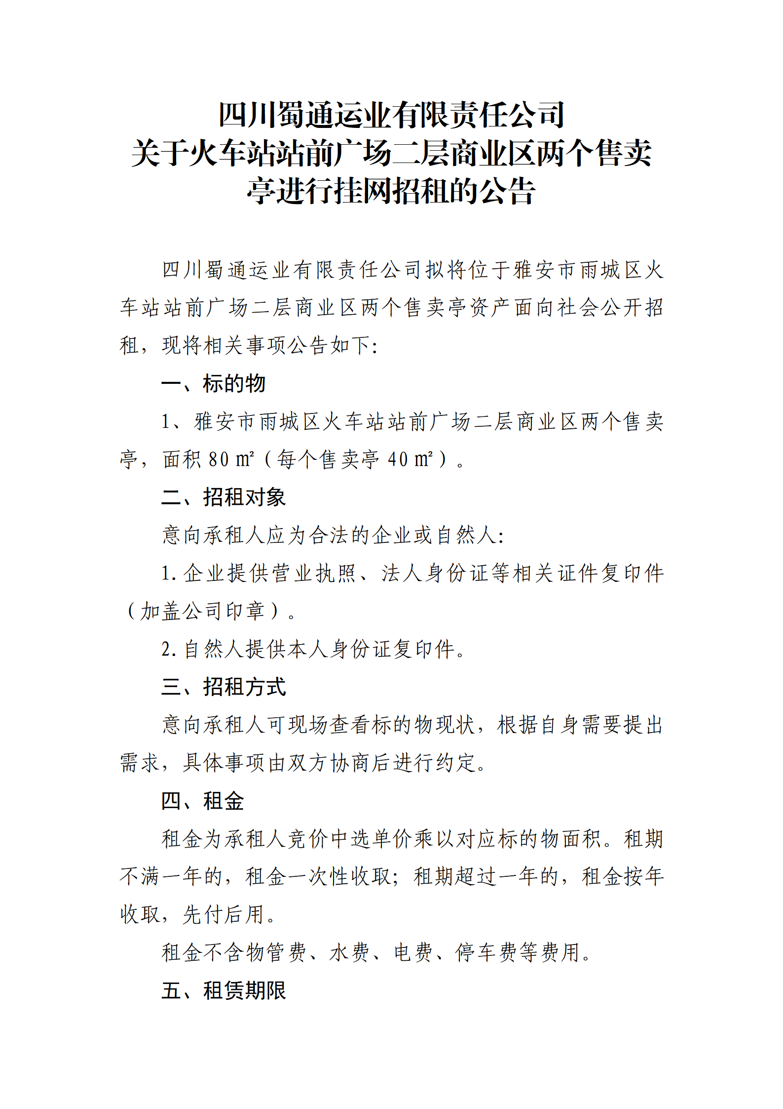 四川蜀通運業(yè)有限責(zé)任公司關(guān)于火車站站前廣場二層商業(yè)區(qū)兩個售賣亭進行掛網(wǎng)招租的公告