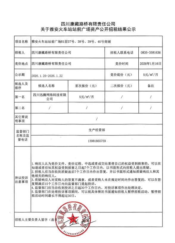 四川康藏路橋有限責(zé)任公司關(guān)于雅安火車(chē)站站前廣場(chǎng)資產(chǎn)公開(kāi)招租結(jié)果公示
