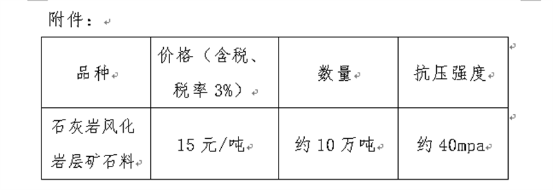 現(xiàn)將我公司礦山首采平臺(tái)的石灰?guī)r風(fēng)化巖層礦石料定價(jià)出售事宜進(jìn)行公示(見附件),經(jīng)公司研究決定,定價(jià)出售風(fēng)化巖層礦石料約10萬噸,現(xiàn)通過集團(tuán)公司官網(wǎng)信息公示后對外銷售。報(bào)名客戶數(shù)不限,銷售方式為先款后貨,簽約銷售,銷售時(shí)間以礦山開采和生產(chǎn)計(jì)劃為準(zhǔn)。