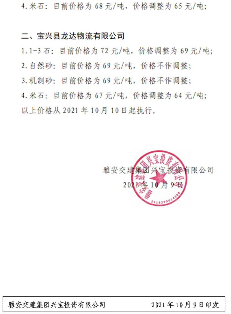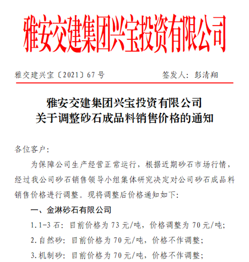 雅安交建集團(tuán)興寶公司關(guān)于調(diào)整砂石成品料銷(xiāo)售價(jià)格的通知(2021.9.28)