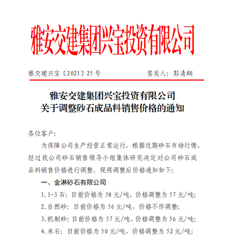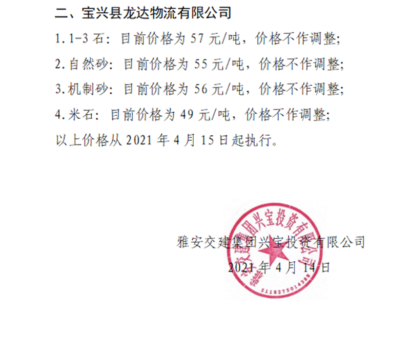 雅安交建集團(tuán)興寶公司砂石骨料銷售價格情況表(2021.4.15)