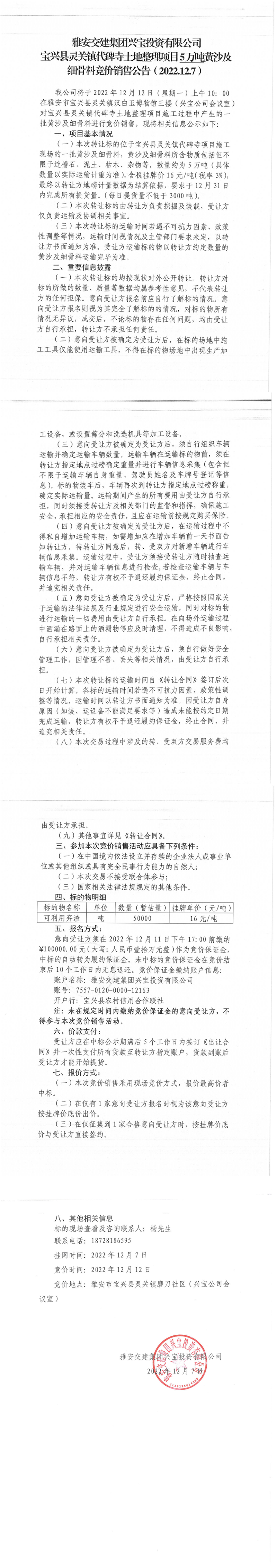 雅安交建集團興寶投資有限公司寶興縣靈關(guān)鎮(zhèn)代碑寺土地整理項目5萬噸黃沙及細(xì)骨料競價銷售成交公告(2022-12-12)