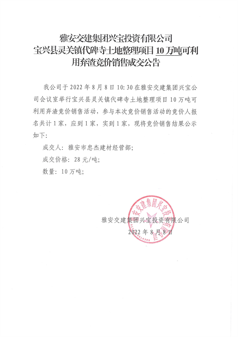 代碑寺土地整理項(xiàng)目10萬噸可利用棄渣競價(jià)銷售成交公告