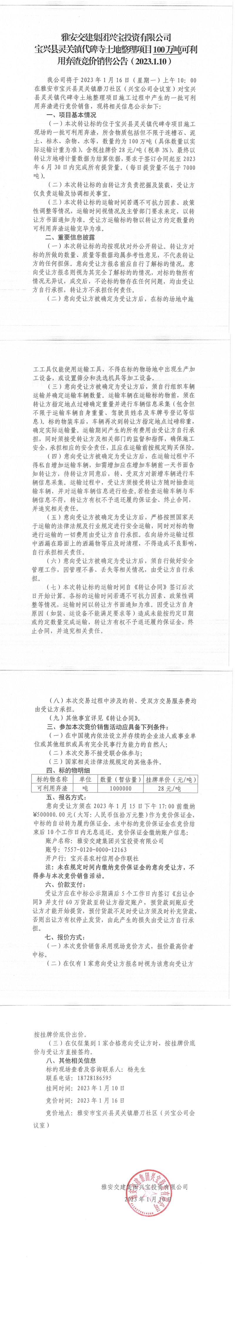 雅安交建集團興寶投資有限公司靈關(guān)鎮(zhèn)代碑寺土地整理項目100萬噸可利用棄渣競價銷售公告(2023.1.10)