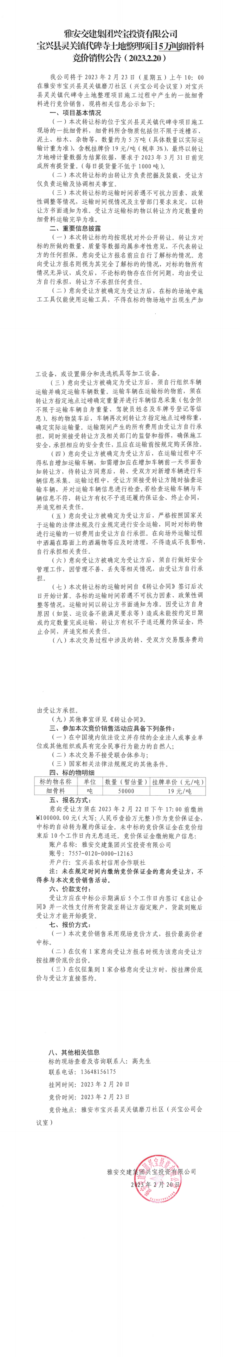 雅安交建集團興寶投資有限公司寶興縣靈關(guān)鎮(zhèn)代碑寺土地整理項目5萬噸細(xì)骨料競價銷售公告(2023.2.20)