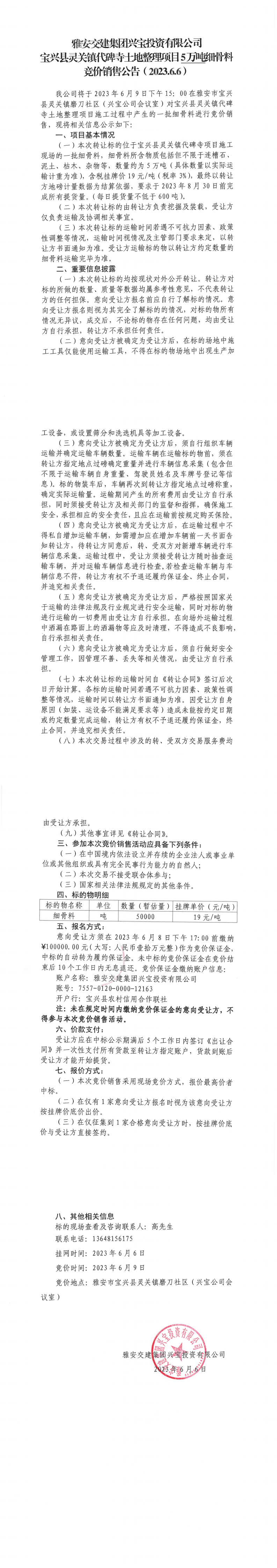 雅安交建集團興寶投資有限公司寶興縣靈關(guān)鎮(zhèn)代碑寺土地整理項目5萬噸細(xì)骨料競價銷售公告(2023.6.6)