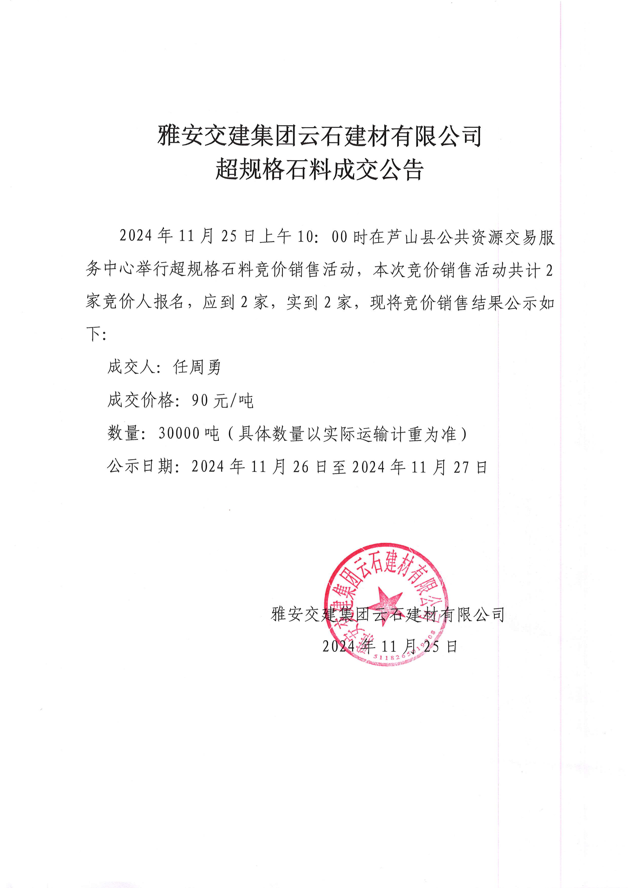 ÑŰ²½»½¨¼¯ˆF(tu¨¢n)ÔÆÊ¯½¨²ÄÓÐÏÞ¹«Ë¾³¬ÒŽ(gu¨©)¸ñʯÁϸ‚(j¨¬ng)ƒr(ji¨¤)äNÊ۳ɽ»¹«¸æ£¨2024-11-26£©